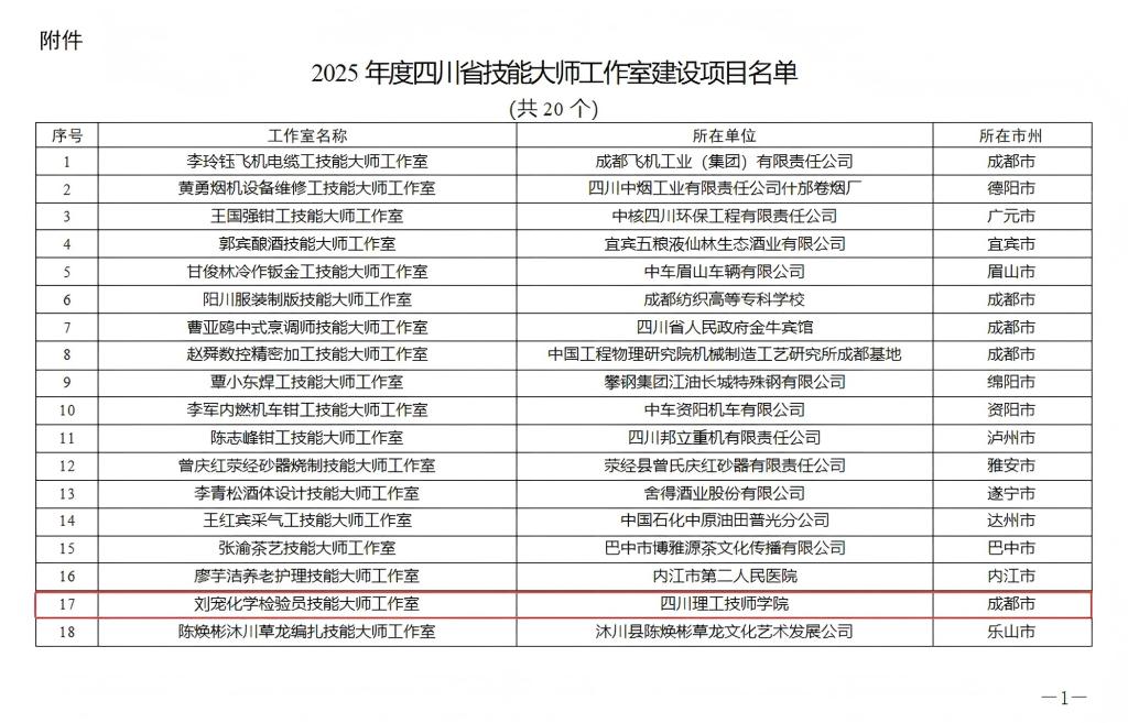 近日,四川省人力资源和社会保障厅等五部门联合公布了“2025年度四川省技能大师工作室建设项目名单”,我院“刘宠化学检验员技能大师工作室”成功入选,正式获批为四川省级技能大师工作室!