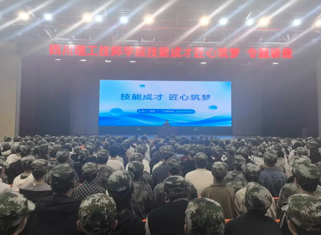 10月20日,四川理工技师学院首届校园文化周迎来重磅活动!作为“技能强心·报国有我”主题系列活动的重要环节,“大国工匠进校园”分享会在我校学府校区体育馆火热开讲。全国技术能手、四川工匠贺希老师现身说法,以“技能成才 匠心筑梦”为题,用自己从农村少年蜕变为世赛国手、金牌教练的励志人生,为1300余名新生点燃技能报国的青春之火。